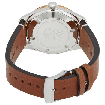 Stainless steel case with a brown leather strap. Uni-directional rotating black DLC bezel ring with a bronze outer rim. Black dial with luminous bronze hands and dot hour markers. Minute markers around the outer rim. Dial Type: Analog. Luminescent hands and markers. Date display at the 3 o'clock position. Oris calibre 733, base SW 200-1 automatic movement, based upon SW 200-1, containing 26 Jewels, bitting at 28800 vph, and has a power reserve of approximately 38 hours. Scratch resistant sapphire crystal. Screw down crown. Solid case back. Round case shape. Case size: 42 mm. Band width: 21 mm. Tang clasp. Water resistant at 100 meters / 330 feet. Functions: date, hour, minute, second. Divers Sixty-five Series. Casual watch style. Watch label: Swiss Made. Oris Divers Sixty-Five Automatic Black Dial Men's Watch 01 733 7720 4354-07 5 21 45.