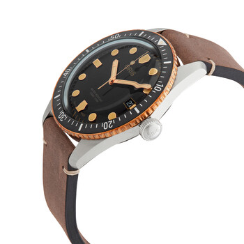 Stainless steel case with a brown (calfskin) leather strap. Uni-directional rotating black DLC bezel with a bronze outer rim. Black dial with luminous yellow gold-tone hands and dot hour markers. Minute markers around the outer rim. Dial Type: Analog. Luminescent hands and markers. Date display at the 3 o'clock position. Oris calibre 733 automatic movement, based upon Sellita SW200-1, containing 26 Jewels, bitting at 28800 vph, and has a power reserve of approximately 38 hours. Scratch resistant sapphire crystal. Screw down crown. Solid case back. Round case shape. Case size: 42 mm. Band width: 21 mm. Tang clasp. Water resistant at 100 meters / 330 feet. Functions: date, hour, minute, second. Casual watch style. Watch label: Swiss Made. Oris Divers Sixty-Five Automatic Black Dial Men's Watch 01 733 7720 4354-07 5 21 44.