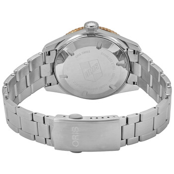 Stainless steel case with a stainless steel bracelet. Uni-directional rotating black DLC bezel with a bronze outer rim. Green dial with luminous rose gold-tone hands and dot hour markers. Minute markers around the outer rim. Dial Type: Analog. Luminescent hands and markers. Date display at the 6 o'clock position. Oris calibre 733, base SW 200-1 automatic movement, based upon SW 200-1, containing 26 Jewels, bitting at 28800 vph, and has a power reserve of approximately 38 hours. Scratch resistant sapphire crystal. Screw down crown. Solid case back. Round case shape. Case size: 40 mm. Case thickness: 13.14 mm. Band width: 20 mm. Fold over clasp. Water resistant at 100 meters / 330 feet. Functions: date, hour, minute, second. Casual watch style. Watch label: Swiss Made. Oris Divers Sixty-Five Automatic Green Dial Men's Watch 01 733 7707 4357-07 8 20 18.