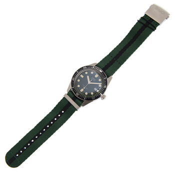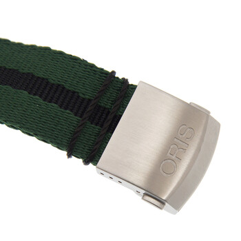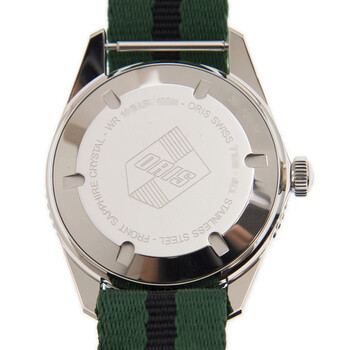 Silver-tone stainless steel case with a green canvas strap. Uni-directional rotating black bezel. Green dial with silver-tone hands and index hour markers. Minute markers around the outer rim. Dial Type: Analog. Luminescent hands and markers. Date display at the 3 o'clock position. Oris Calibre 733 automatic movement with a 38-hour power reserve. Scratch resistant sapphire crystal. Transparent case back. Round case shape. Case size: 42 mm. Water resistant at 100 meters / 330 feet. Functions: date, hour, minute, second. Additional Info: original box, international warranty card, manual (complete accessories). Luxury watch style. Watch label: Swiss Made. Oris Divers Sixty-Five Automatic Green Dial Unisex Watch 733 7720 4057 5 21 25FC.