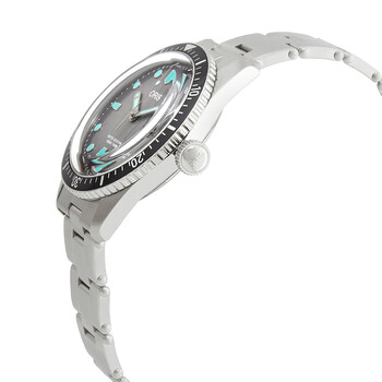 Stainless steel case with a stainless steel bracelet. Uni-directional rotating stainless steel bezel with an inlaid black DLC ring. Grey dial with luminous silver-tone hands and index hour markers. Minute markers around the outer rim. Dial Type: Analog. Luminescent hands and markers. Oris calibre 733, base SW 200-1 automatic movement, based upon SW 200-1, containing 26 Jewels, bitting at 28800 vph, and has a power reserve of approximately 38 hours. Scratch resistant sapphire crystal. Screw down crown. Solid case back. Round case shape. Case size: 40 mm. Case thickness: 13.14 mm. Band width: 20 mm. Fold over clasp. Water resistant at 100 meters / 330 feet. Functions: hour, minute, second. Divers Sixty-five Series. Casual watch style. Watch label: Swiss Made. Oris Divers Sixty-Five Automatic Grey Dial Men's Watch 01 733 7707 4053-07 8 20 18.