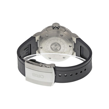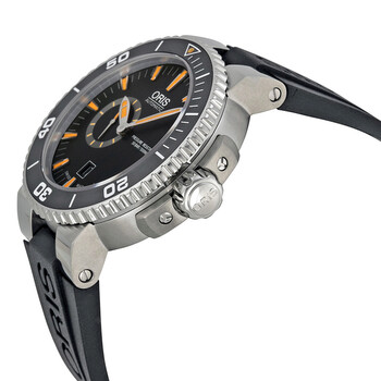 Silver-tone stainless steel case with a black rubber strap. Uni-directional rotating coin edge stainless steel bezel with a black PVD count-up elapsed time top ring. Black dial with luminous hands and stick hour markers. Minute markers around the outer rim. Dial Type: Analog. Luminescent hands and markers. Date display at the 6 o'clock position. One subdial displaying: small second at the 9 o'clock position. Oris Calibre 743, base SW 220-1 Automatic movement, based upon SW 220-1, containing 28 Jewels, bitting at 28800 vph, and has a power reserve of approximately 38 hours. Scratch resistant sapphire crystal. Screw down crown. Solid case back. Round case shape, case size: 46 mm, case thickness: 17 mm. Band width: 22 mm. Fold over clasp. Water resistant at 500 meters / 1650 feet. Functions: date, hour, minute, second. Divers Series. Dive watch style. Watch label: Swiss Made. Oris Divers Small Seconds Automatic Black Dial Steel Men's Watch 743-7673-4159RS.