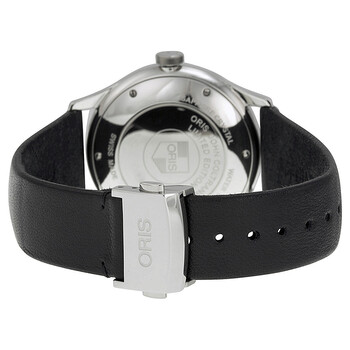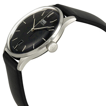 Stainless steel case with a black leather strap. Fixed stainless steel bezel. Black dial with silver-tone hands and index hour markers. Minute markers around the outer rim. Dial Type: Analog. Date display at the 6 o'clock position. Automatic movement. Scratch resistant sapphire crystal. Pull / push crown. Solid case back. Case diameter: 38 mm. Round case shape. Fold over clasp. Water resistant at 30 meters / 100 feet. Casual watch style. Oris John Coltrane Automatic Black Dial Black Leather Watch 733-7681-4084LS.