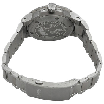 Silver-tone stainless steel case with a brushed & polished stainless steel bracelet. Uni-directional rotating green bezel. Green dial with silver-tone hands and index hour markers. Minute markers around the outer rim. Dial Type: Analog. Luminescent hands and markers. Pointer date. One subdial displaying: small second. Oris Calibre 743 Automatic movement, based upon SW 220-1, containing 28 Jewels, bitting at 28800 vph, and has a power reserve of approximately 38 hours. Anti-reflective scratch resistant sapphire crystal. Screw down crown. Transparent case back. Round case shape, case size: 43.5 mm, case thickness: 12.60 mm. Push button deployant buckle clasp. Water resistant at 300 meters / 1000 feet. Functions: date, hour, minute, small second. Limited Edition Series. Dive watch style. Watch label: Swiss Made. Oris Limited Edition Automatic Green Dial Watch 01 743 7734 4187-Set.
