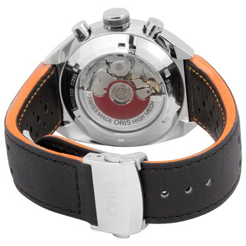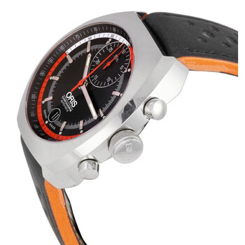 Silver-tone stainless steel case with a two-tone (black and orange) leather strap. Fixed silver-tone stainless steel bezel. Black dial with luminous hands and index hour markers. Tachymeter scale around the outer rim. Dial Type: Analog. Luminescent hands and markers. Date display at the 6 o'clock position. One subdial displaying: 30 minute at the 12 o'clock position. Oris Calibre 672, base ETA 7750 Automatic movement, based upon ETA 7750, containing 25 Jewels, bitting at 28800 vph, and has a power reserve of approximately 48 hours. Scratch resistant sapphire crystal. Screw down case back. Round case shape, case size: 42 mm, case thickness: 20 mm. Tang clasp. Water resistant at 50 meters / 165 feet. Functions: hours, minutes, seconds, calendar, chronograph, tachymeter. Additional Info: leather box set, can be used as collector folder, second stainless steel bracelet, tool to exchange it. Chronoris Series. Sport watch style. Watch label: Swiss Made. Item Variations: Oris 672 7564 4154 SET, 67275644154SET, 672.7564.4154S.ET. Oris Men's Chronoris Chronograph Automatic Stainless Steel Watch 672-7564-4154SET.
