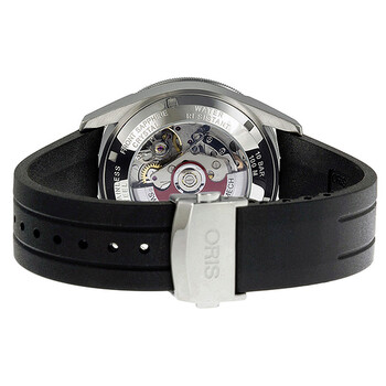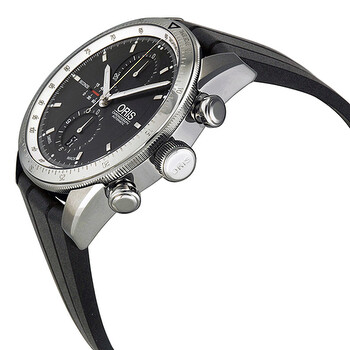 Stainless steel case with a black rubber strap. Uni-directional rotating stainless steel bezel. Black dial with silver-tone hands and index hour markers. Minute markers around the outer rim. Tachymeter around the inner bezel. Dial Type: Analog. Luminescent hands and markers. Date display at the 6 o'clock position. Chronograph - three sub-dials displaying: 60 second, 30 minute and 12 hour. Automatic movement. Scratch resistant sapphire crystal. Screw down crown. Transparent case back. Case diameter: 44 mm. Case thickness: 15 mm. Round case shape. Band width: 22 mm. Band length: 8.5 inches. Deployment clasp. Water resistant at 100 meters / 330 feet. Functions: chronograph, date, hour, minute, second. Sport watch style. Watch label: Swiss Made. Oris Motor Sport Artix GT Chronograph Men's Watch 674-7661-4174RS.