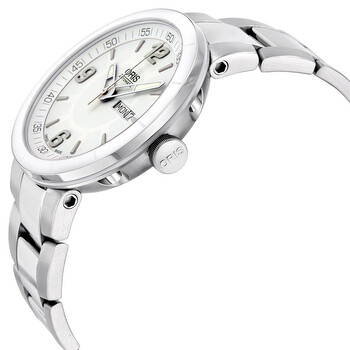 Stainless steel case with a stainless steel bracelet. Fixed stainless steel bezel. White dial with luminous hands and stick hour markers. Arabic numerals mark the 6, 9 and 12 o'clock positions. minute markers around the outer rim.. Dial Type: Analog. Luminescent hands and markers. Date and day of the week display at the 3 o'clock position. Automatic movement. Oris 735 (basverk sw 220) engine. Scratch resistant sapphire crystal. Fluted with oris logo crown. Skeleton case back. Case diameter: 43 mm. Case thickness: 12 mm. Round case shape. Band width: 25 mm. Band length: 8.5 inches. Deployment clasp. Water resistant at 100 meters / 330 feet. Functions: date, day, hour, minute, second. Casual watch style. Watch label: Swiss Made. Item Variations: 735 7651 4166MB, 735.7651.4166MB, 73576514166MB. Oris Motor Sport TT1 Men's Watch 735-7651-4166MB.