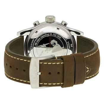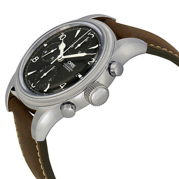 Stainless steel case with a dark brown leather strap. Fixed stainless steel bezel. Black dial with silver-tone hands and alternating Arabic numeral and index hour markers. Minute markers around the outer rim. Dial Type: Analog. Luminescent hands and markers. Date display at the 3 o'clock position. Chronograph - three sub-dials displaying: 60 second, 60 minute and 12 hour. Automatic movement. Scratch resistant Plexi crystal. Solid case back. Case diameter: 42 mm. Round case shape. Tang clasp. Water resistant at 30 meters / 100 feet. Functions: date, hour, minute, second. Additional Info: certificate, limited to 300. Casual watch style. Watch label: Swiss Made. Oris Oskar Bider Limited Edition Black Dial Brown Leather Men's Watch 01 774 7567 4084-Set LS.