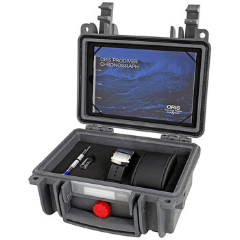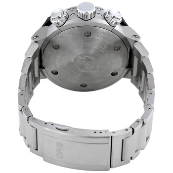 Silver-tone titanium case with a silver-tone titanium bracelet. Black dial with silver-tone hands and index hour markers. Minute markers around the outer rim. Dial Type: Analog. Date display at the 6 o'clock position. Chronograph - three sub-dials displaying: 60 second, 30 minute and 12 hour. 774, base SW 500 automatic movement with a 48-hour power reserve. Scratch resistant sapphire crystal. Screw down crown. Case size: 51 mm. Round case shape. Band width: 26 mm. Deployment clasp. Water resistant at 100 meters / 330 feet. Functions: chronograph, date, hour, minute, second. Luxury watch style. Watch label: Swiss Made. Oris ProDiver Chronograph Black Dial Automatic Men's Watch 774-7727-7154MB.