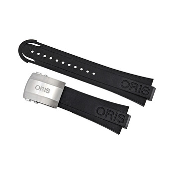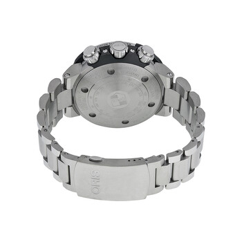 Titanium case with a titanium bracelet. Fixed black rubber ceramic bezel. Black dial with silver-tone hands and index hour markers. Minute markers around the outer rim. Dial Type: Analog. Luminescent hands and markers. Date display at the 6 o'clock position. Chronograph - three sub-dials displaying: 12 hour, 30 minute and 1/4 of a second. Automatic movement. Scratch resistant sapphire crystal. Screw down crown. Solid case back. Case diameter: 51 mm. Case thickness: 19.5 mm. Round case shape. Band width: 25.3 mm. Fold over clasp with safety release. Water resistant at 1000 meters / 3281 feet. Functions: date, hour, minute, second, chronograph. Additional Info: waterproof presentation box set, additional rubber strap, professional strap changing tools. Casual watch style. Watch label: Swiss Made. Oris ProDiver Chronograph Black Dial Titanium Men's Watch 01 774 7683 7154-Set.