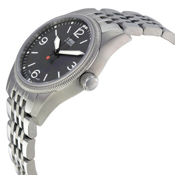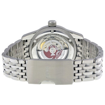 Stainless steel case with a stainless steel bracelet. Fixed stainless steel bezel. Black dial with luminous hands and index hour markers. Arabic numerals mark the 3, 6, 9 and 12 o'clock positions. Minute markers around the outer rim. Dial Type: Analog. Luminescent hands and markers. Automatic movement. Scratch resistant sapphire crystal. Skeleton case back. Case diameter: 38 mm. Round case shape. Fold over clasp. Water resistant at 100 meters / 330 feet. Functions: hour, minute, second. Casual watch style. Watch label: Swiss Made. Oris Swiss Hunter Team Black Dial Stainless Steel Mid Size Watch 733-7649-4063MB.