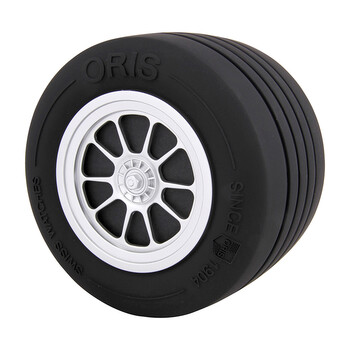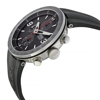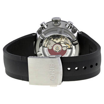 Stainless steel case with a black rubber strap. Fixed black ion-plated bezel with tachymeter. Black dial with luminous hands and index hour markers. Arabic numerals mark the 3 and 9 o'clock positions. Minute markers around the outer rim. Dial Type: Analog. Luminescent hands and markers. Date display at the 6 o'clock position. Chronograph - three sub-dials displaying: 60 second, 30 minute and 12 hour. Automatic movement. Scratch resistant sapphire crystal. Pull / push crown. Skeleton case back. Case diameter: 45 mm. Round case shape. Tang clasp. Water resistant at 100 meters / 330 feet. Functions: chronograph, tachymeter, date, hour, minute, second. Casual watch style. Watch label: Swiss Made. Oris TT1 Automatic Chronograph Black Rubber Strap Men's Watch 674-7659-4174RS.