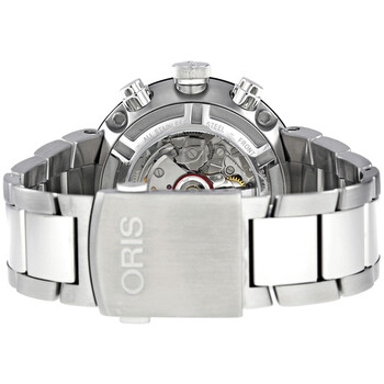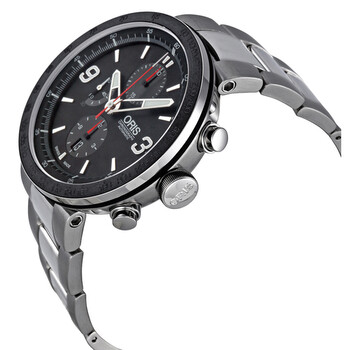Stainless steel case with a stainless steel bracelet. Fixed black ion-plated bezel. Black dial with silver-tone hands and index hour markers. Arabic numerals amrk thr 3 and 9 o'clock positions. Minute markers around the outer rim. Dial Type: Analog. Luminescent hands and markers. Date display appears at the 6 o'clock position. Chronograph - three sub-dials displaying: 12 hours, 30 minutes and 1/4 second. Automatic movement. Scratch resistant sapphire crystal. Pull / push crown. Exhibition case back. Case diameter: 45 mm. Round case shape. Deployment clasp. Water resistant at 100 meters / 330 feet. Functions: chronograph, date, hour, minute, second. Casual watch style. Watch label: Swiss Made. Oris TT1 Chrono Black Dial Automatic Chronograph Stainless Steel Men's Watch 01 674 7659 4174 07 8 25 10.
