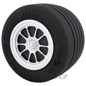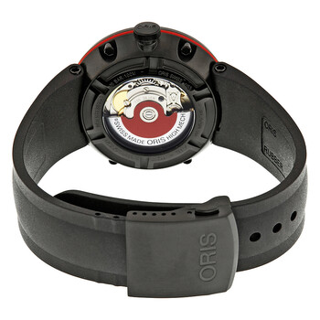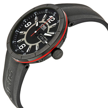 Black DLC stainless steel case with a black rubber strap. Fixed black DLC bezel. Black dial with luminous hands and index hour markers. Arabic numerals mark the 6, 9 and 12 o'clock positions. Minute markers around the outer rim. Dial Type: Analog. Luminescent hands and markers. Day of the week and date display at the 3 o'clock position. Automatic movement with a 38-hour power reserve. Scratch resistant sapphire crystal. Pull / push crown. Skeleton case back. Case diameter: 43 mm. Case thickness: 12.25 mm. Round case shape. Band width: 20 mm / 25 mm. Band length: 8.5 inches. Deployment clasp. Water resistant at 100 meters / 330 feet. Functions: date, day, hour, minute, second. Casual watch style. Watch label: Swiss Made. Oris TT1 Day Date Automatic Black Dial Men's Watch 735-7651-4764RS.