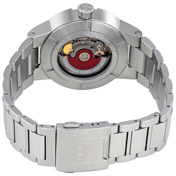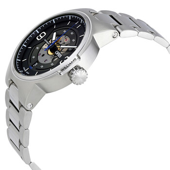 Stainless steel case with a stainless steel bracelet. Silver-tone stainless steel bezel. Skeleton dial with black hands and index-Arabic numerals hour markers. Dial Type: Analog. Luminescent hands and markers. Date display at the 6 o'clock position. Oris Calibre 733 automatic movement with a 38-hour power reserve. Scratch resistant sapphire crystal. Skeleton transparent exhibition see through case back. Case size: 42 mm. Round case shape. Band width: 24 mm. Water resistant at 100 meters / 330 feet. Functions: date, hour, minute, second. Luxury watch style. Watch label: Swiss Made. Oris Williams Engine Automatic Men's Stainless Steel Watch 01 733 7716 4164-07 8 24 50.