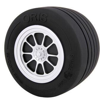 Stainless steel case with a black rubber strap. Fixed stainless steel bezel with black top ring with tachymeter markings. Black dial with silver-toned hands and index hour markers. Arabic numerals mark the 3 and 9 o'clock positions.Mminute markers around the outer rim. Dial Type: Analog. Luminescent hands and markers. Date display at the 3 o'clock position. Two sub-dials displaying: 12 hour and 30 minute. Automatic movement. Scratch resistant sapphire crystal. Skeleton case back. Case diameter: 44 mm. Round case shape. Deployment clasp. Water resistant at 100 meters / 330 feet. Functions: chronograph, date, hour, minute, second. Luxury watch style. Watch label: Swiss Made. Oris Williams F1 Team Black Dial Rubber Strap Men's Watch 773-7685-4184RS.