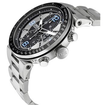 Stainless steel case with a stainless steel bracelet. Unidirectional rotating black ion-plated with tach bezel. Black & silver dial with luminous hands and index hour markers. Arabic numerals mark the 6, 9 and 12 o'clock positions. Minute markers on the outer rim. Luminescent hands and markers. Date and day display at the 3 o'clock positions. Two - 30 minutes and 12 hours sub-dials. Automatic movement. Scratch resistant sapphire crystal. Screw down crown. Skeleton case back. Case diameter: 45 mm. Case thickness: 15 mm. Deployment clasp. Water resistant at 100 meters / 330 feet. Functions: hours, minutes, seconds, calendar, chronograph, tachymeter. Oris Williams F1 Team Chronograph Men's Automatic Watch 679-7614-4174MB.