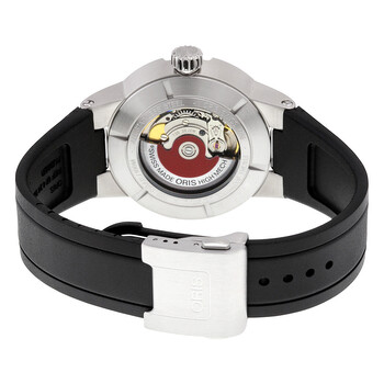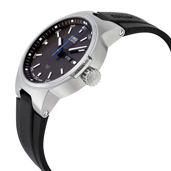 Stainless steel case with a black rubber strap. Fixed stainless steel bezel. Black dial with luminous black hands and index hour markers. Minute markers around the outer rim. Dial Type: Analog. Luminescent hands and markers. Day of the week and date display at the 3 o'clock position. Automatic movement with a 38-hour power reserve. Scratch resistant sapphire crystal. Screw down crown. Transparent case back. Case diameter: 42 mm. Case thickness: 12.1 mm. Round case shape. Band width: 24 mm. Deployment clasp with push button release. Water resistant at 100 meters / 330 feet. Functions: date, day, hour, minute, second. Luxury watch style. Oris Williams F1 Team Day Date Autoamtic Black Dial Black Rubber Men's Watch 01 735 7716 4154-07 4 24 50.