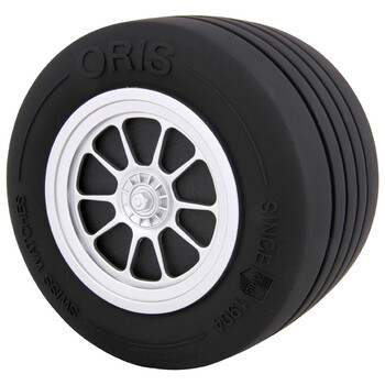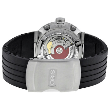 Stainless steel case with a black rubber bracelet. Fixed stainless steel bezel. Black dial with luminous silver-tone hands and indexes hour markers. Arabic numerals mark the 6, 9 and 12 o'clock positions. Minute markers around the outer rim. Day and date display at the 3 o'clock position. Self winding automatic movement. Scratch resistant sapphire crystal. Skeletal case back. Case diameter: 42 mm. Case thickness: 10.9 mm. Deployment clasp. Water resistant at 100 meters / 330 feet. Oris Williams F1 Team Day-Date Men's Automatic Watch 635-7613-4174RS.