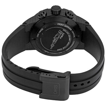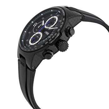 Black DLC titanium and carbon fiber case with a black rubber strap. Fixed black DLC stainless steel showing tachymeter markings bezel. Black (carbon fiber) dial with luminous black hands and index hour markers. Arabic numerals appear at the 3 and 9 o'clock positions. Arabic numeral minute markers (at 5 minute intervals). Minute markers around the outer rim. Dial Type: Analog. Luminescent hands and markers. Date display at the 6 o'clock position. Chronograph - three sub-dials displaying: 12 hours, 30 minutes and 60 seconds. Oris Calibre 774, base SW 500 automatic movement with a 48-hour power reserve. Scratch resistant sapphire crystal. Solid case back. Round case shape, case size: 44 mm, case thickness: 15 mm. Band width: 24 mm. Push button deployant clasp. Water resistant at 100 meters / 330 feet. Functions: chronograph, date, hour, minute, second. Williams Fw41 Limited Edition Series. Sport watch style. Watch label: Swiss Made. Oris Williams FW41 Limited Edition Chronograph Automatic Black Dial Men's Watch 01 774 7725 8794-RS set.