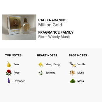Part of the Floral Woody Musk fragrance family, Million Gold opens with a fresh and radiant burst of pear, rose, and lavender. These top notes create a soft yet sparkling introduction that’s both uplifting and refined. As the scent unfolds, heart notes of ylang ylang and jasmine bloom with rich floral elegance, wrapping the senses in warmth and beauty.