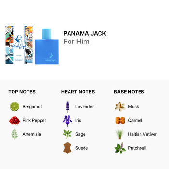 Panama Jack For Him opens with a crisp burst of bergamot, pink pepper, and artemisia—an energizing trio that sets a vibrant and masculine tone. As the fragrance unfolds, heart notes of lavender, iris, sage, suede, and saffron add depth and sophistication. These layers create a warm, earthy vibe that’s both smooth and charismatic.