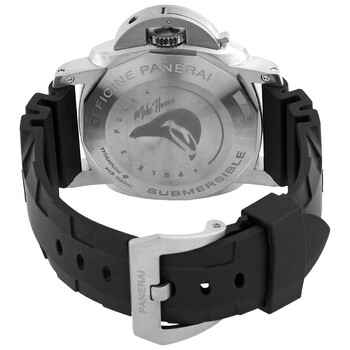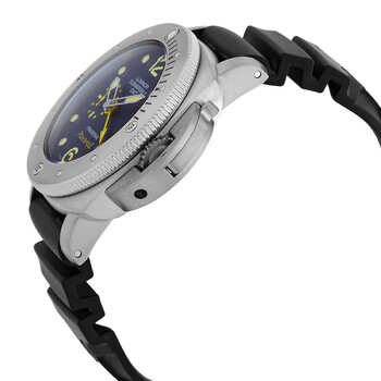 Silver-tone titanium case with a black rubber strap. Bi-directional rotating bezel. Blue dial with silver-tone hands and Arabic numeral/dots hour markers. Minute markers around the outer rim. Dial Type: Analog. Luminescent hands and markers. Date display at the 3 o'clock position. Panerai Calibre P.9001 Automatic movement, containing 29 Jewels, composed of 229 parts, bitting at 28800 vph, and has a power reserve of approximately 72 hours. Scratch resistant sapphire crystal. Solid case back. Cushion case shape, case size: 47 mm. Buckle clasp. Water resistant at 300 meters. Functions: date, hour, minute, second. Luxury watch style. Watch label: Swiss Made. Panerai Automatic Blue Dial Men's Watch PAM00719.