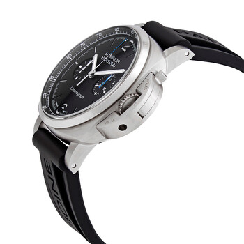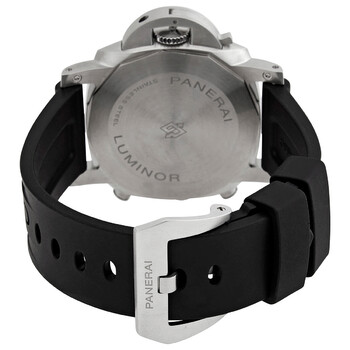 Aisi 316L brushed steel case with a black (alligator) leather strap. Fixed polished steel bezel. Black dial with luminous silver-tone hands and index hour markers. Arabic numeral markers appear at the 6 and 12 o'clock positions. Minute markers. Tachymeter markings around the outer rim. Dial Type: Analog. Luminescent hands and markers. Chronograph - two sub-dials displaying: 30 minute and small second. Caliber P.9200 automatic movement. Scratch resistant sapphire crystal. Screw down crown. Solid case back. Cushion case shape. Case size: 44 mm. Tang clasp. Water resistant at 100 meters / 330 feet. Functions: chronograph, tachymeter, hour, minute, second. Luxury watch style. Watch label: Swiss Made. Panerai Chronograph Automatic Black Dial Men's Watch PAM01109.