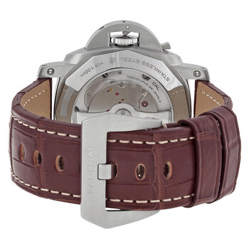 Silver-tone polished stainless steel case with a brown leather strap. Fixed silver-tone stainless steel bezel. Black dial with luminous hands and index hour markers. Arabic numerals mark the 6, 9, and 12 o'clock positions. Dial Type: Analog. Luminescent hands and dial markers. Date display at the 3 o'clock position. Two sub-dials displaying: 24 hour and power reserve indicator. Panerai Calibre P.2003 Automatic movement, containing 25 Jewels, composed of 281 parts, bitting at 28800 vph, and has a power reserve of approximately 240 hours. Scratch resistant sapphire crystal. Fluted, locked with security lever crown. Stainless steel case back. Cushion case shape, case size: 44 mm. Band length: 8.5 inches. Tang clasp. Water resistant at 100 meters / 330 feet. Functions: GMT, second time zone, date, hour, minute, small second, power reserve indicator, day/night indicator. Luminor 1950 10 Days Gmt Series. Luxury watch style. Watch label: Swiss Made. Item Variations: PAM 270, PAM270, PAM-270, PAM 270-J. Panerai Luminor 1950 10 Days GMT 44mm Stainless Steel Men's Watch PAM00270.