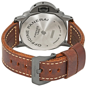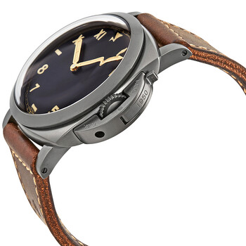 Grey dlc titanium case with a brown leather strap. Fixed grey dlc titanium bezel. Black dial with yellow hands and Roman numeral hour markers. Minute markers around the outer rim. Dial Type: Analog. Luminescent hands and markers. Panerai Calibre P.3000 hand wind movement with a 72-hour power reserve. Scratch resistant sapphire crystal. Solid case back. Cushion case shape. Case size: 47 mm. Buckle clasp. Water resistant at 100 meters / 330 feet. Functions: hour, minute. Luxury watch style. Watch label: Swiss Made. Panerai Luminor 1950 3 Days Black Dial Men's Watch PAM00629.