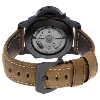 Matt black ceramic case with a assolutamente dark brown leather strap. Fixed matt black ceramic bezel. Black dial with luminous brown hands and index hour markers. Arabic numerals mark the 6, 9 and 12 o'clock positions. minute markers around the outer rim. Dial Type: Analog. Luminescent hands and markers. Date display at the 3 o'clock position. Small seconds sub-dial at the 9 o'clock position. Panerai calibre P.9100 automatic movement, containing 37 Jewels, composed of 302 parts, bitting at 28800 vph, and has a power reserve of approximately 72 hours. Scratch resistant sapphire crystal formed of corundum. Screw down crown. Skeleton case back. Cushion case shape. Case size: 44 mm. Band width: 22.9 mm. Band length: 9 inches. Tang clasp. Water resistant at 100 meters / 330 feet. Functions: chronograph, column wheel, flyback, date, hour, minute, second. Luminor 1950 Chrono Flyback Series. Luxury watch style. Watch label: Swiss Made. Panerai Luminor 1950 3 Days Chrono Flyback Automatic Men's Watch PAM00580.