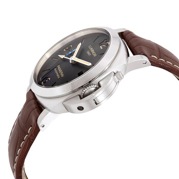 Silver-tone stainless steel case with a brown alligator leather strap. Fixed silver-tone stainless steel bezel. Black dial with luminous silver-tone hands and index hour markers. Arabic numerals mark the 6, 9 and 12 o'clock positions. Dial Type: Analog. Luminescent hands and markers. Date display at the 3 o'clock position. 60 second subdials. Panerai Calibre P.9011 Automatic movement, containing 31 Jewels, composed of 239 parts, bitting at 28800 vph, and has a power reserve of approximately 72 hours. Scratch resistant sapphire crystal. Protected crown. Transparent case back. Cushion case shape. Case size: 44 mm. Band width: 24 mm. Tang clasp. Water resistant at 300 meters / 1000 feet. Functions: GMT, second time zone, hour, minute, second, date, power reserve indicator. Luxury watch style. Watch label: Swiss Made. Panerai Luminor 1950 Automatic Black Dial Men's Watch PAM01320.