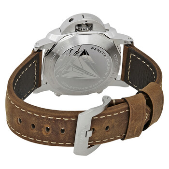 Stainless steel case with a brown leather strap. Fixed stainless steel bezel. Black dial with luminous silver-tone hands and Arabic numeral hour markers. Arabic numeral minute markers (at 5 minute intervals). Minute markers. Tachymeter markings around the outer rim. Dial Type: Analog. Luminescent hands and markers. Chronograph - two sub-dials displaying: 60 second and 12 hour. Panerai Calibre P.9100 Automatic movement, containing 37 Jewels, composed of 302 parts, bitting at 28800 vph, and has a power reserve of approximately 72 hours. Scratch resistant sapphire crystal. Screw down crown. Solid case back. Cushion case shape. Case size: 44 mm. Band width: 24 mm. Tang clasp. Water resistant at 100 meters / 330 feet. Functions: flyback chronograph, hour, minute, second, seconds reset. Luminor 1950 Series. Luxury watch style. Watch label: Swiss Made. Panerai Luminor 1950 Automatic Flyback Chronograph Men's Watch PAM00653.