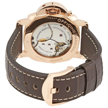 18kt rose gold case with a brown alligator leather strap. Fixed 18kt rose gold bezel. Brown dial with luminous hands and Arabic numeral and index hour markers. Dial Type: Analog. Date display at the 3 o'clock position. Small seconds/24 hour indicator sub-dial subdials. Panerai Calibre P.2002 Hand Wind movement, containing 21 Jewels, composed of 247 parts, bitting at 28800 vph, and has a power reserve of approximately 192 hours. Scratch resistant sapphire crystal. Screw down crown. See through sapphire crystal case back. Cushion case shape. Case size: 44 mm. Buckle clasp. Water resistant at 50 meters / 165 feet. Functions: GMT, second time zone, date, hour, minute, small second, power reserve indicator, day/night indicator. Luxury watch style. Watch label: Swiss Made. Panerai Luminor 1950 Brown Dial 18k Rose Gold Men's Watch PAM00576.