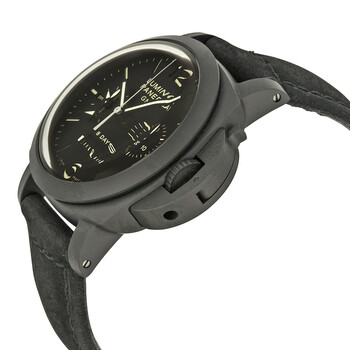 Black ceramic case with a black leather strap. Fixed black ceramic bezel. Black dial with luminous hands and index hour markers. Arabic numerals mark the 6 and 12 o'clock positions. minute markers around the outer rim. Dial Type: Analog. Luminescent hands and markers. Linear power reserve indicator at 6 o'clock. Three sub-dials displaying: 24 hour/60 second, 30 minute and power reserve indicator. Panerai Calibre P.2004 Hand Wind movement, based upon Panerai P.2002, containing 29 Jewels, composed of 321 parts, bitting at 28800 vph, and has a power reserve of approximately 72 hours. Scratch resistant sapphire crystal. Screw down crown. Transparent case back. Cushion case shape, case size: 44 mm, case thickness: 17.5 mm. Band width: 22.9 mm, band length: 9 inches. Ceramic tang clasp. Water resistant at 100 meters / 330 feet. Functions: chronograph, column wheel, GMT, second time zone, hour, minute, small second, power reserve indicator. Luminor 1950 Chrono Monopulsante 8 Days Gmt Series. Luxury watch style. Watch label: Swiss Made. Panerai Luminor 1950 Chronograph Men's Watch PAM00317.