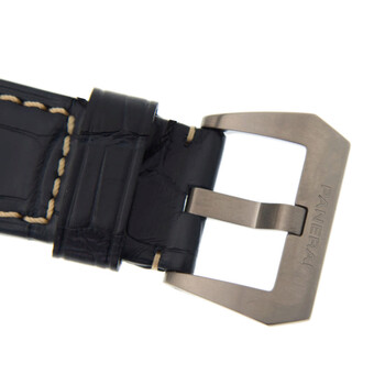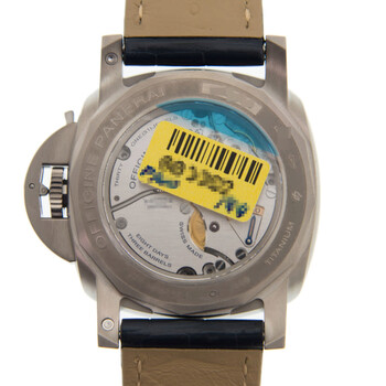 Silver-tone titanium case with a blue alligator leather strap. Fixed silver-tone titanium bezel. Blue dial with gold-tone hands and Arabic numeral and index hour markers. Dial Type: Analog. Luminescent hands. Date display at the 4 o'clock position. Four - 24 hour/60 minute, month, equation of time and power reserve indicator subdials. Panerai Calibre P.2002/E Hand Wind movement, based upon Panerai Calibre P.2002, containing 31 Jewels, composed of 328 parts, bitting at 28800 vph, and has a power reserve of approximately 172 hours. Scratch resistant sapphire crystal. Brushed titanium crown protector crown. Transparent case back. Cushion case shape. Case size: 47 mm. Water resistant at 100 meters / 330 feet. Functions: equation of time, month, date, GMT, second time zone, hour, minute, small second, power reserve indicator, day/night indicator. Luxury watch style. Watch label: Swiss Made. Panerai Luminor 1950 Equation of Time Blue Dial Men's Watch PAM00670.