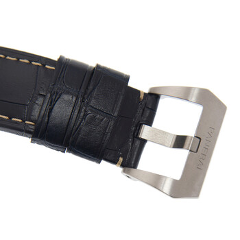 Stainless steel case with a blue leather strap. Fixed stainless steel bezel. Blue dial with luminous silver-tone hands and index hour markers. Arabic numerals appear at the 6, 9 and 12 o'clock positions. Dial Type: Analog. Date display at the 3 o'clock position. Linear power reserve indicator. Panerai calibre P.2003 automatic movement, containing 25 Jewels, composed of 281 parts, bitting at 28800 vph, and has a power reserve of approximately 240 hours. Scratch resistant sapphire crystal. Screw down crown. Transparent case back. Cushion case shape. Case size: 44 mm. Tang clasp. Water resistant at 100 meters / 330 feet. Functions: hours, minutes, small seconds, date, GMT, 24h indicator, power reserve indicator, seconds reset. Additional Info: original box, international warranty card, manual (complete accessories). Luminor 1950 Series. Luxury watch style. Watch label: Swiss Made. Panerai Luminor 1950 GMT 10 Day Power Reserve Automatic Blue Dial Men's Watch PAM00986.