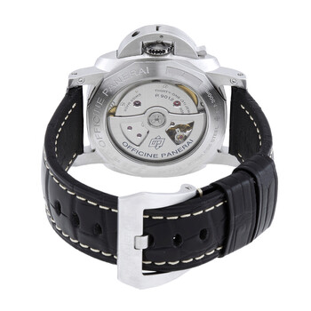 Stainless steel case with a black (alligator) leather strap. Fixed stainless steel bezel. Black dial with luminous silver-tone hands and index hour markers. Arabic numerals mark the 6, 9 and 12 o'clock positions. Dial Type: Analog. Luminescent hands and markers. Date display at the 3 o'clock position. Two displays showing: 60 second and power reserve. Panerai calibre P.9012 automatic movement with a 3-day power reserve. Scratch resistant sapphire crystal. Protected crown. Transparent case back. Cushion case shape. Case size: 44 mm. Band width: 24 mm. Tang clasp. Water resistant at 300 meters / 1000 feet. Functions: GMT, second time zone, hour, minute, second, date, power reserve. Luxury watch style. Watch label: Swiss Made. Panerai Luminor 1950 GMT Automatic Black Dial 44 mm Men's Watch PAM01321.