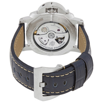 Stainless steel case with a blue (alligator) leather strap. Fixed stainless steel bezel. Blue dial with luminous silver-tone hands and index hour markers. Arabic numerals mark the 6, 9 and 12 o'clock positions. Dial Type: Analog. Luminescent hands and markers. Date display at the 3 o'clock position. Small seconds sub-dial at the 9 o'clock position. Panerai calibre P.9011 automatic movement, containing 31 Jewels, composed of 239 parts, bitting at 28800 vph, and has a power reserve of approximately 72 hours. Scratch resistant sapphire crystal. Protected crown. Transparent case back. Cushion case shape. Case size: 44 mm. Band width: 24 mm. Tang clasp. Water resistant at 300 meters / 1000 feet. Functions: GMT, second time zone, hour, minute, second, date, power reserve indicator. Luminor 1950 Series. Dive watch style. Watch label: Swiss Made. Panerai Luminor 1950 GMT Automatic Blue Dial Men's Watch PAM01033.