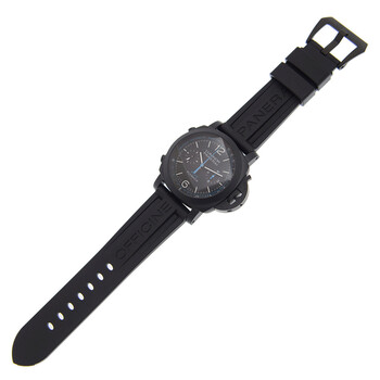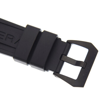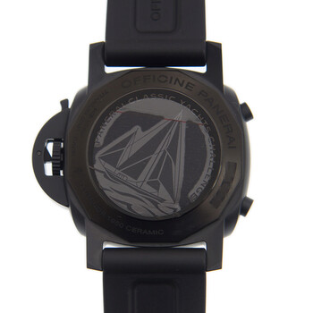 Ceramic case with a black rubber strap. Fixed stainless steel bezel. Black dial with Arabic numeral & index hour markers. Minute markers. tachymeter markings around the outer rim. Dial Type: Analog. Luminescent hands and markers. Chronograph - two sub-dials displaying: 60 second and 12 hours. Panerai Calibre P.9100 automatic movement with a 3-day power reserve. Scratch resistant sapphire crystal. Screw down crown. Solid case back. Cushion case shape. Case size: 44 mm. Band width: 24 mm. Tang clasp. Water resistant at 100 meters / 330 feet. Functions: flyback chronograph, hour, minute, second, seconds reset. Luxury watch style. Watch label: Swiss Made. Panerai Luminor 1950 PCYC Chronograph Automatic Black Dial Men's Watch PAM00788.