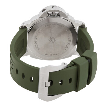 Silver-tone stainless steel case with a olive rubber strap. Fixed silver-tone stainless steel bezel. White dial with silver-tone hands and index-Arabic numeral hour markers. Dial Type: Analog. Panerai Calibre P.6000 Hand Wind movement, containing 19 Jewels, bitting at 21600 vph, and has a power reserve of approximately 72 hours. Scratch resistant sapphire crystal. Screw down crown. Solid case back. Cushion case shape, case size: 44 mm. Folding clasp. Water resistant at 100 meters / 330 feet. Functions: hour, minute. Luxury watch style. Watch label: Swiss Made. Panerai Automatic White Dial Men's Watch PAM01087.