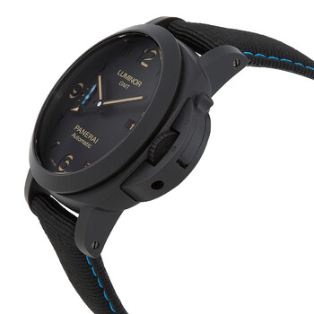 Black ceramic case with a black leather strap. Fixed black ceramic bezel. Black dial with luminous black hands and index hour markers. Arabic numerals appear at the 6, 9 and 12 o'clock positions. Dial Type: Analog. Luminescent hands and markers. Date display at the 3 o'clock position. One subdial displaying: small seconds. Panerai Calibre P.9010 Automatic movement, containing 31 Jewels, composed of 200 parts, bitting at 28800 vph, and has a power reserve of approximately 72 hours. Scratch resistant sapphire crystal. Pull / push crown. Solid case back. Cushion case shape, case size: 44 mm. Tang clasp. Water resistant at 100 meters / 330 feet. Functions: GMT, second time zone, hour, minute, second. Luminor Series. Luxury watch style. Watch label: Swiss Made. Panerai Luminor Automatic Black Dial Men's Watch PAM01441BK.