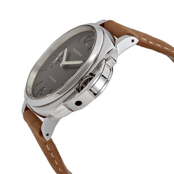 Stainless steel case with a brown (calfskin) leather strap. Fixed stainless steel bezel. Grey dial with luminous silver-tone hands and index hour markers. Arabic numerals mark the 6 and 12 o'clock positions. Dial Type: Analog. Luminescent hands. Date display at the 3 o'clock position. Small seconds sub-dial at the 9 o'clock position. Panerai calibre OP XXXIV automatic movement, containing 25 Jewels, bitting at 28800 vph, and has a power reserve of approximately 72 hours. Scratch resistant sapphire crystal. Pull / push crown. Solid case back. Cushion case shape. Case size: 38 mm. Case thickness: 11.2 mm. Band width: 20 mm. Tang clasp. Water resistant at 30 meters / 100 feet. Functions: date, day, hour, minute, second. Sport watch style. Watch label: Swiss Made. Panerai Luminor Automatic Grey Dial Men's Watch with Brown Strap PAM00755-BR.