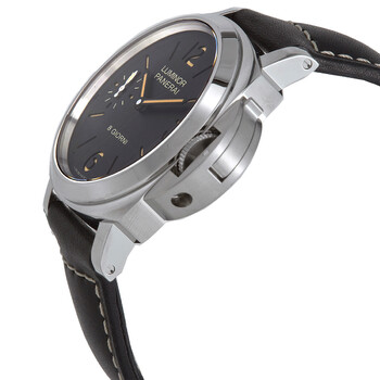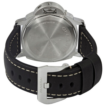 Silver-tone stainless steel case with a black (calfskin) leather strap. Fixed silver-tone stainless steel bezel. Black dial with luminous black hands and index hour markers. Arabic numerals mark the 3, 6 and 12 o'clock positions. Dial Type: Analog. Luminescent hands and markers. One subdial displaying: small seconds. Panerai Calibre P.5000 Hand Wind movement, containing 21 Jewels, composed of 127 parts, bitting at 21600 vph, and has a power reserve of approximately 192 hours. Scratch resistant sapphire crystal. Pull / push crown. Solid case back. Cushion case shape, case size: 44 mm. Band width: 22 mm / 24 mm. Tang clasp. Water resistant at 30 meters / 100 feet. Functions: hour, minute, small second. Additional Info: original box, manual (complete accessories). Luminor Base Series. Luxury watch style. Watch label: Swiss Made. Panerai Luminor Base Hand Wind Black Dial Men's Watch PAM00915.