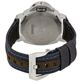 Stainless steel case with a black canvas strap. Fixed stainless steel bezel. Black dial with luminous black hands and index hour markers. Arabic numerals mark the 3, 6, 9 and 12 o'clock positions. Dial Type: Analog. Luminescent hands and markers. Panerai calibre P.6000 hand wind movement, containing 19 Jewels, bitting at 21600 vph, and has a power reserve of approximately 72 hours. Scratch resistant sapphire crystal. Pull / push crown. Solid case back. Cushion case shape. Case size: 44 mm. Case thickness: 13.05 mm. Band width: 24 mm. Tang clasp. Water resistant at 100 meters / 330 feet. Functions: hour, minute. Luxury watch style. Watch label: Swiss Made. Panerai Luminor Black Dial Black Canvas Men's Watch PAM00774.