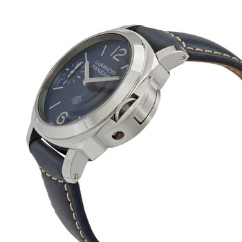 Stainless steel case with a blue leather strap. Fixed stainless steel bezel. Blue dial with index numeral hour markers. Arabic numerals appear at the 3, 6 and 12 o'clock positions. Dial Type: Analog. Small seconds sub-dial. Panerai calibre P.6000 hand wind movement, containing 19 Jewels, bitting at 21600 vph, and has a power reserve of approximately 72 hours. Scratch resistant sapphire crystal. Solid case back. Cushion case shape. Case size: 44 mm. Case thickness: 13.05 mm. Tang clasp. Water resistant at 100 meters / 330 feet. Functions: hour, minute, second. Additional Info: original box, manual (complete accessories). Luminor Series. Luxury watch style. Watch label: Swiss Made. Panerai Luminor Blu Mare Hand Wind Blue Dial Men's Watch PAM01085.