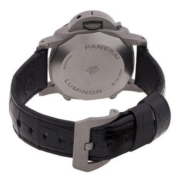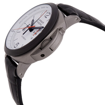 Silver-tone titanium case with a black alligator leather strap. Fixed black carbotech bezel. White dial with black hands and index-Arabic numeral hour markers. Minute markers around the outer rim. Dial Type: Analog. Luminescent hands and markers. Chronograph - two sub-dials displaying: 12 hour and small second. Panerai Calibre P.9100 Automatic movement, containing 37 Jewels, composed of 302 parts, bitting at 28800 vph, and has a power reserve of approximately 72 hours. Scratch resistant sapphire crystal. Screw down crown. Solid case back. Round case shape, case size: 44 mm. Water resistant at 100 meters / 330 feet. Functions: chronograph, column wheel, flyback, date, hour, minute, second. Luminor Chrono Series. Luxury watch style. Watch label: Swiss Made. Panerai Luminor Chrono Automatic White Dial Watch PAM01297.