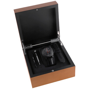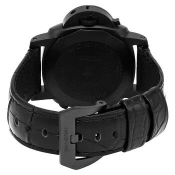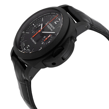 Black ceramic case with a black alligator leather strap. Fixed black ceramic bezel. Black sun-brushed dial with black hands and index-Arabic numeral hour markers. Minute markers around the outer rim. Arabic numerals at 6 and 12 o clock. Dial Type: Analog. Luminescent hands and markers. One subdial displaying: small second. Panerai Calibre P.9100 Automatic movement, containing 37 Jewels, composed of 302 parts, bitting at 28800 vph, and has a power reserve of approximately 72 hours. Scratch resistant sapphire crystal. Screw down crown. Solid case back. Cushion case shape, case size: 44 mm, case thickness: 8.15 mm. Tang clasp. Water resistant at 100 meters / 330 feet. Functions: chronograph, column wheel, flyback, date, hour, minute, second. Luminor Chrono Flyback Ceramica Series. Luxury watch style. Watch label: Swiss Made. Panerai Luminor Chrono Flyback Ceramica Chronograph Automatic Men's Watch PAM01298.