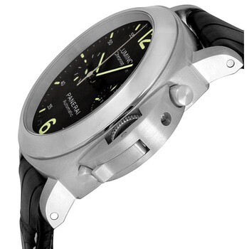 Silver-tone stainless steel case with a black croco embossed leather strap with contrast s strap. Fixed silver-tone stainless steel bezel. Black dial with luminous hands and luminous stick hour markers. Arabic numerals mark thje 6 and 12 o'clock positions. minute markers arond the outer rim. Dial Type: Analog. Luminescent hands and markers. Chronograph - two sub-dials displaying: 60l seconds and 30 minutes. Panerai Calibre OP XIX Automatic movement, based upon ETA 7750, containing 30 Jewels, bitting at 28800 vph, and has a power reserve of approximately 42 hours. Scratch resistant anti-reflective sapphire crystal. Stainless steel, protected crown. Sapphire crystal exhibition case back. Cushion case shape, case size: 40 mm, case thickness: 17 mm. Tang clasp. Water resistant at 100 meters / 330 feet. Functions: chronograph, flyback, hour, minute, small second, tachymeter. Sport watch style. Watch label: Swiss Made. Panerai Luminor Chrono Men's Watch PAM00310.