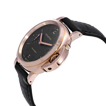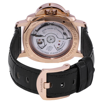 Polished goldtech case with a black (alligator) leather strap. Fixed polished goldtech bezel. Black sun-brushed dial with luminous rose gold hands and index hour markers. Arabic numerals appear at the 6 and 12 o'clock positions. Dial Type: Analog. Luminescent hands. Date display at the 3 o'clock position. One subdial displaying: small seconds. Panerai calibre P.900 automatic movement, based upon Panerai OP XXXIV, containing 25 Jewels, bitting at 28800 vph, and has a power reserve of approximately 72 hours. Scratch resistant sapphire crystal. Transparent case back. Cushion case shape. Case size: 38 mm. Tang clasp. Water resistant at 30 meters / 100 feet. Functions: date, hour, minute, small second. Luminor Due Series. Luxury watch style. Watch label: Swiss Made. Panerai Luminor Due Automatic Black Dial Men's Watch PAM01029.